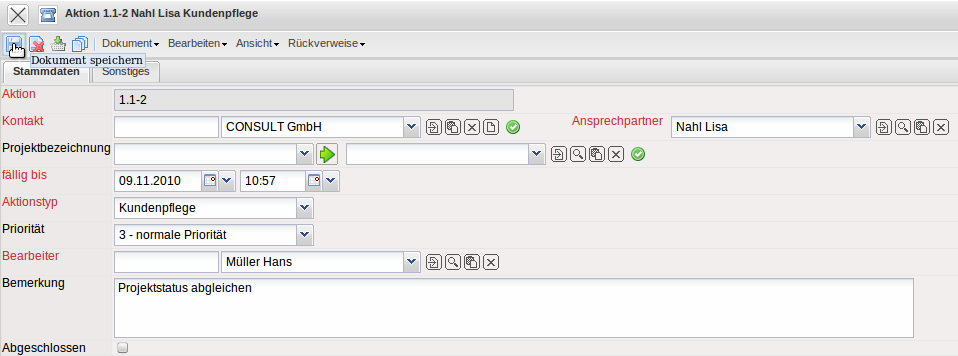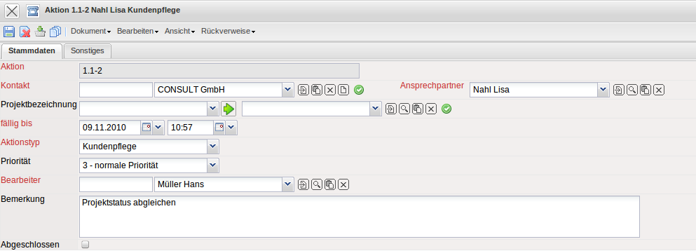 Im Beispiel wird eine Wiedervorlage für die Projektleiterin des Kunden “CONSULT GmbH” zum 09.11.2010 definiert.