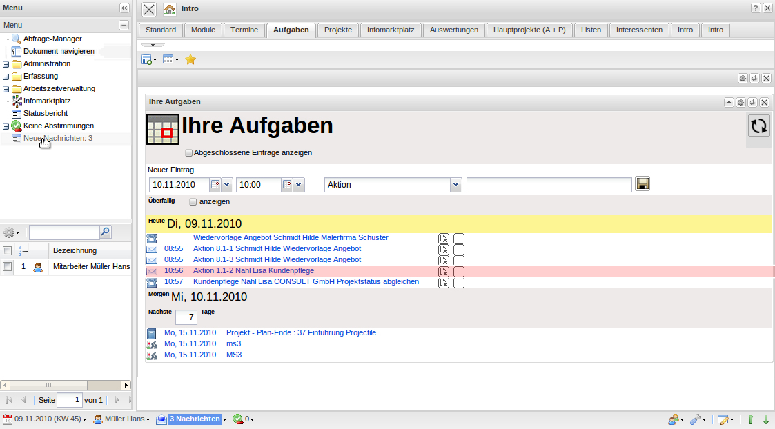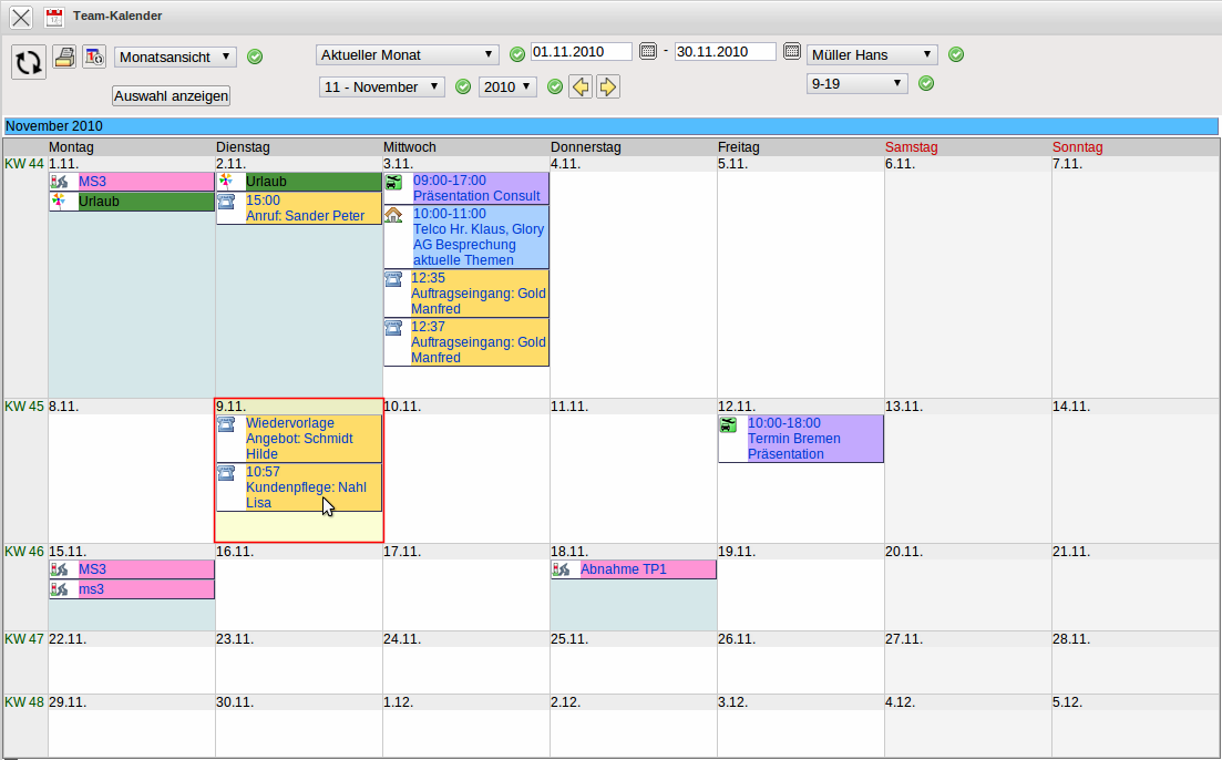 Wenn die optionale Komponente Gruppenterminkalender verwendet wird, erscheint diese Aktion auch im Gruppenterminplaner (hier als Termin von Hans Müller am 09.11.2010) …