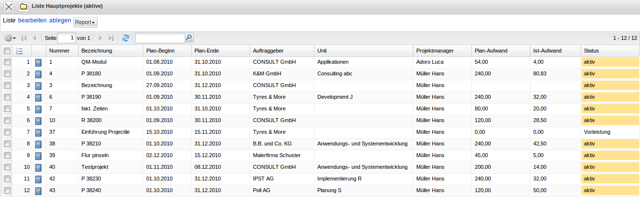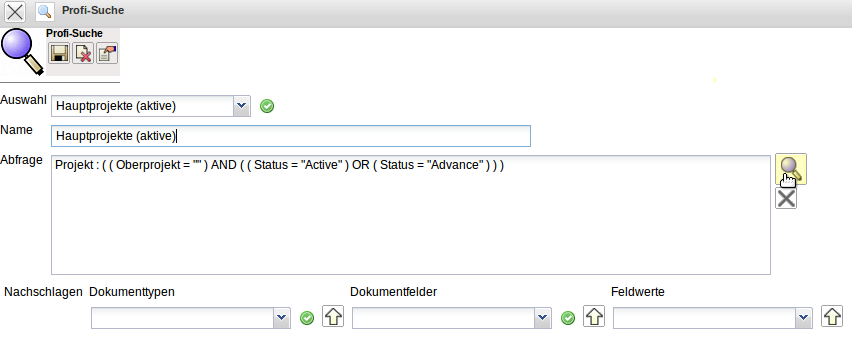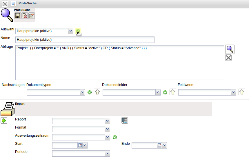 Die Abfrage Projekt : ( ( Oberprojekt = ““ ) AND ( ( Status = “Active“ ) OR ( Status = “Advance“ ) ) ) findet alle laufenden Hauptprojekte (Oberprojekt soll leer sein und der Status muss auf aktiv oder Vorleistung gesetzt sein).