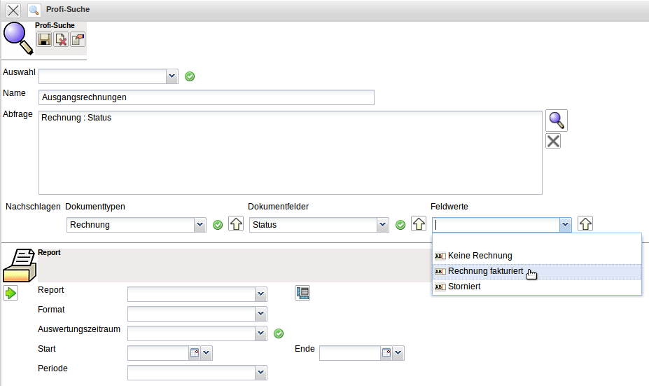 … nachgeschlagen werden. Nach Auswahl des Feldwertes “Rechnung fakturiert” kann mit Hilfe dieser