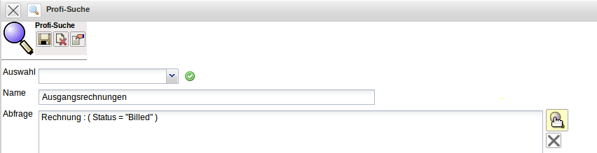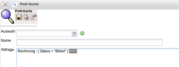 Nach dem Ausführen der Abfrage wird ggf. die Abfrage umformatiert. Im Beispiel wird aus Rechnung : Status = “Billed“ der Ausdruck Rechnung : (Status = “Billed“). Das System setzt in der Regel automatisch Klammern und setzt auch Collections in den Ausdrücken um (hier die Abrechnungsart). Die Transformation der Abfragen muss vom System wegen der Internationalisierung vorgenommen werden, damit unabhängig von der Benutzersprache die Abfragen funktionieren.