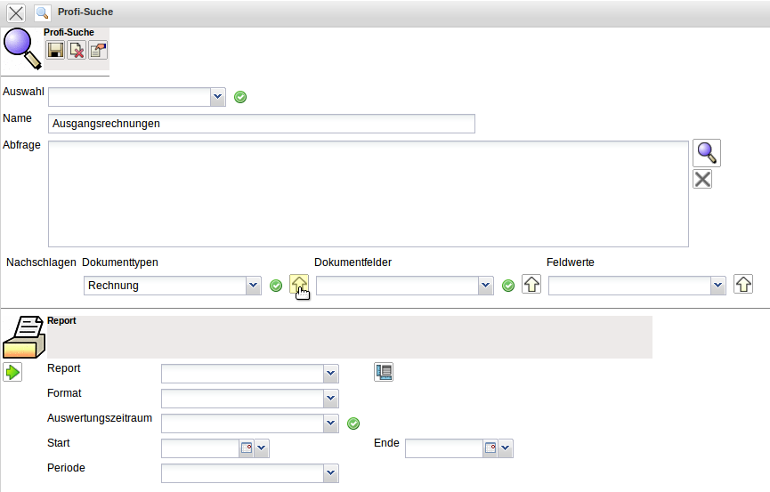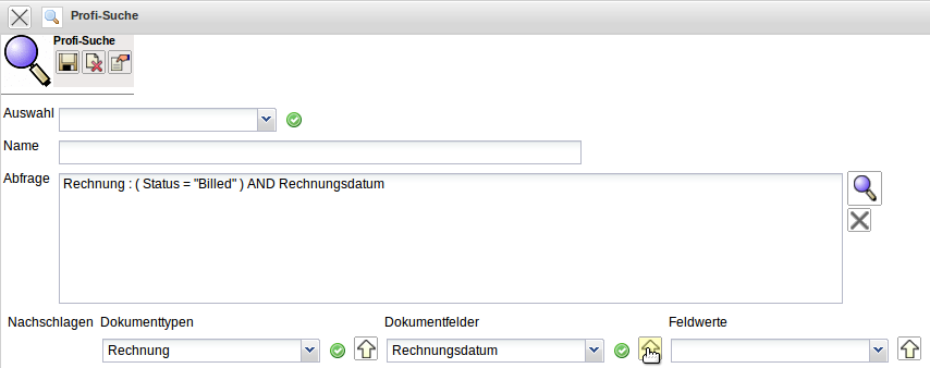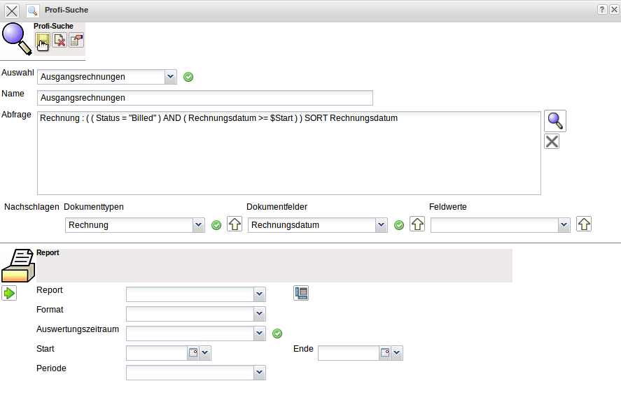 Die erstellte Profi-Suche wird weiter konkretisiert. Im nächsten Schritt wird diese Abfrage mit dem Rechnungsdatum verknüpft.