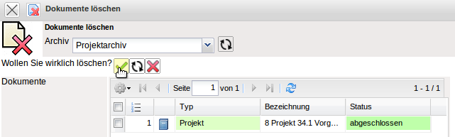 Dieser Dialog ist eine Sicherheitsvorkehrung, da der Löschvorgang nur von ausgewählten Benutzern rückgängig gemacht werden kann (siehe auch Papierkorb/Archiv). Wenn das Projekt gelöscht wird kann es wieder aus dem Archiv hergestellt werden. Analog funktioniert auch die Archivierung zur späteren Wiederherstellung von Projekten oder anderen Datenbeständen.
