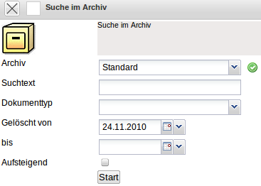 Im Suchdialog kann ein Suchtext, der Dokumenttyp, das Löschdatum und die Sortierreihenfolge eingegeben werden.