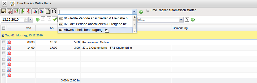Im TimeTracker können verschiedene Workflows für die Behandlung von Zeiten hinterlegt werden (Periodenabschluss, Urlaubsbeantragung, …). Das folgende Beispiel zeigt die Implementierung einer Urlaubsbeantragung. Nach Ausführung der Aktion im TimeTracker …