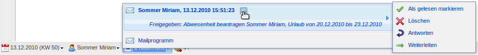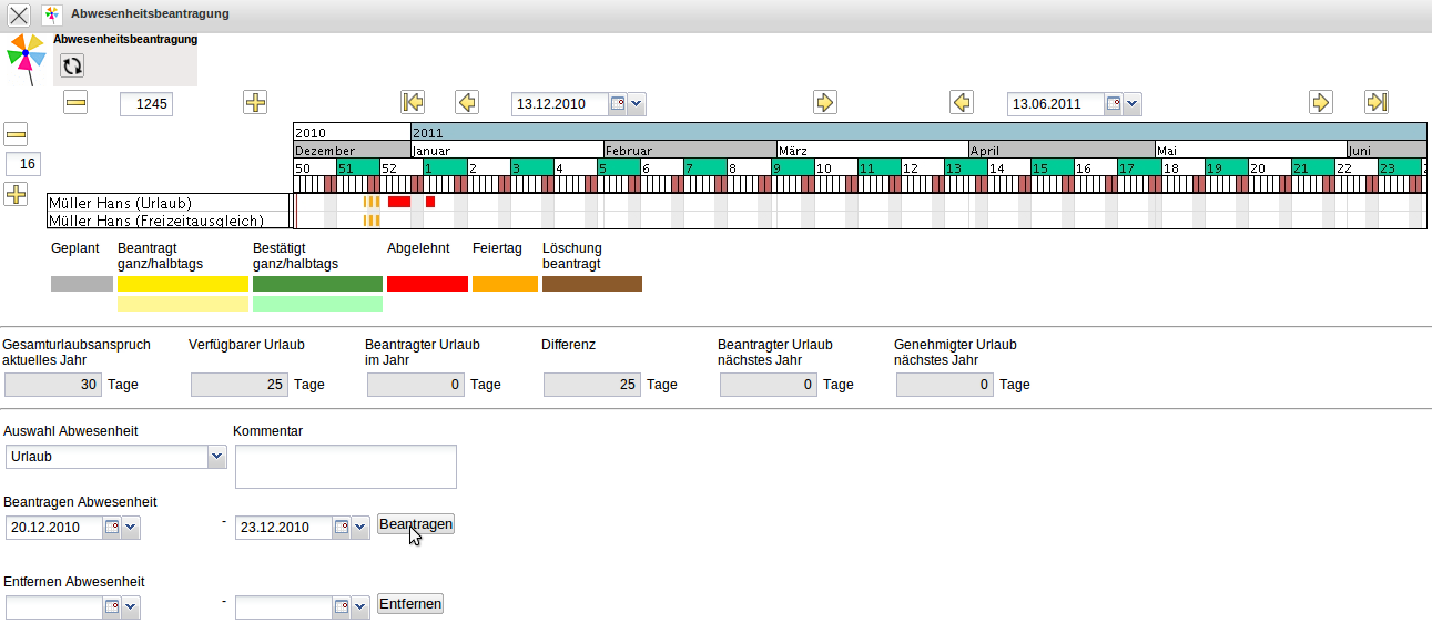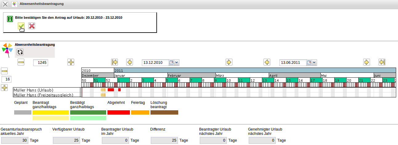 Im folgenden Beispiel wird vom Mitarbeiter Peter Schaub Urlaub vom 18.12.2006 bis zum 29.12.2006 beantragt.