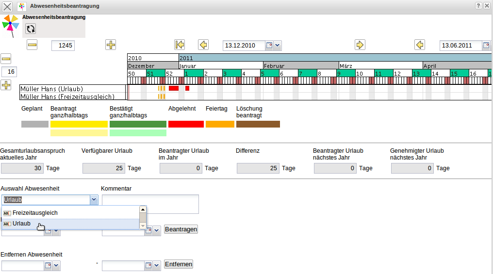 … öffnet sich ein Dialog für die Urlaubsbeantragung. Hier kann der Benutzer Abwesenheiten beantragen (Freizeitausgleich, Erholungs- und Sonderurlaub) und beantragte oder genehmigte Abwesenheiten stornieren.