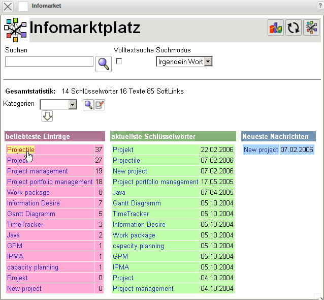 Die Begriffe auf der rechten Seite (Project, project management, GPM, …) sind sogenannte SoftLinks und kennzeichnen Informationen, die vom aktuellen Eintrag heraus aufgerufen worden sind. Wie im menschlichen Gehirn werden häufig benutzte Verknüpfungen in der Auflistung stärker hervorgehoben.