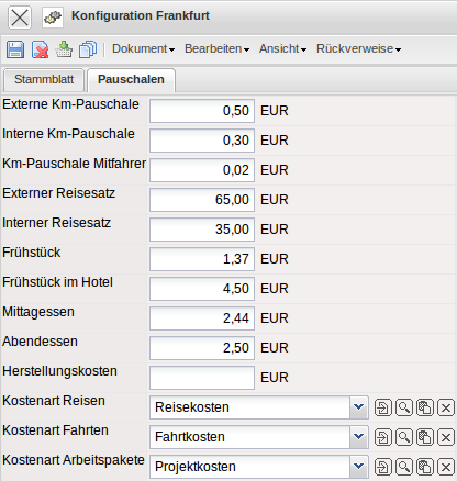 Im Dokumenttyp Konfiguration werden die globalen Parameter für die firmenweiten Einstellungen definiert. Dazu gehören Standort der Projectile-Version, das Land der Firma, die Sprache und die Haus- und Zweitwährung der Firma, die Km-Pauschalen für Dienstfahrten und Reisetätigkeitssätze, Zahlungsziel, Eckwerte für Mahlzeitenstellung (siehe auch Dokumenttyp Reise) und Zuschläge.
