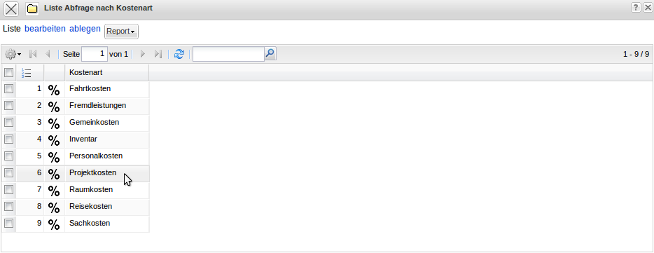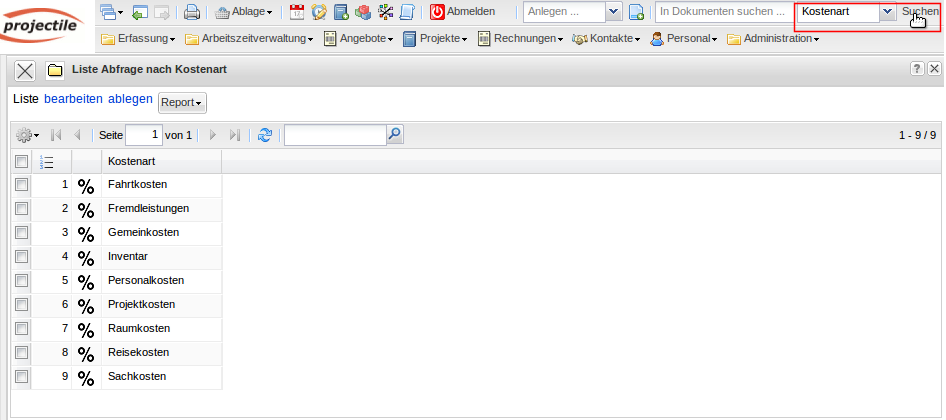 Die Kostenarten bilden die Basis für die Gruppierung bei der Budgetverwaltung und der Kostenerfassung. Das System unterscheidet Projektkosten und Gemeinkosten, die beliebig unterteilt werden können. Einige Projektkosten (Reisekosten, Fahrtkosten, Fremdleistungen) werden zwingend benötigt und sollten (wie die Oberkostenarten Projekt- und Gemeinkosten) nicht gelöscht werden. Die Kostenarten können auch (bei Anbindungen für Finanzbuchhaltungen) Zuordnungen zu Fibu-Konten unterstützen.