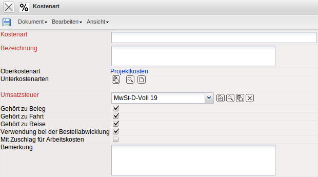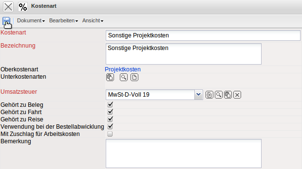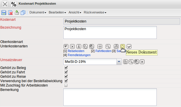 Das System erzeugt ein neues Dokument vom Typ “Kostenart” und belegt die Oberkostenart automatisch mit den “Projektkosten” vor. Anschließend werden die restlichen Eingaben definiert …