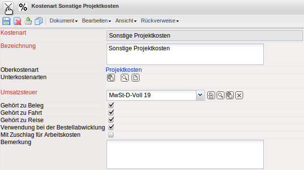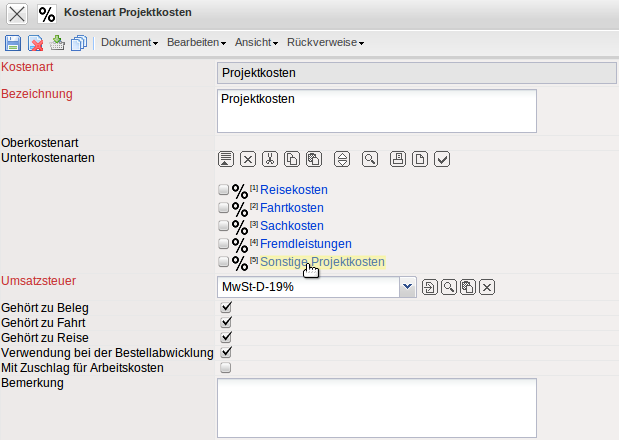 - Einige projektbezogene Unterkostenarten sollten nicht gelöscht werden, da sie vom System benötigt werden. Beispielsweise Reisekosten, Fahrtkosten und Fremdleistungen.