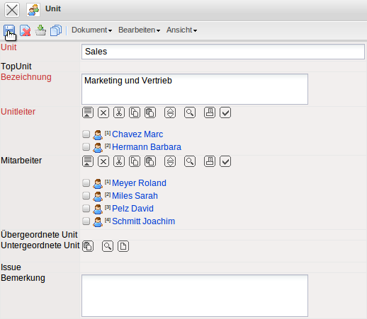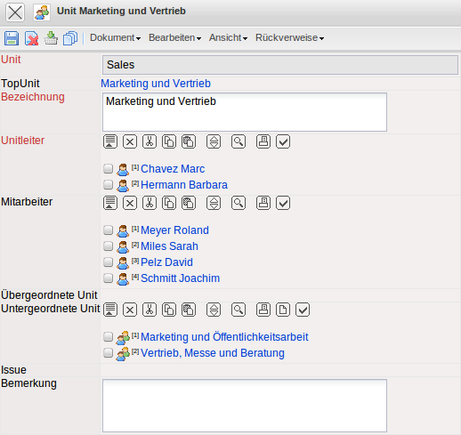 Es besteht die Möglichkeit für diese Unit “Sales”, untergeordnete Units anzulegen. Dazu klickt man auf den Menüpunkt “Neues Dokument” in der Zeile Untergeordnete Unit.
