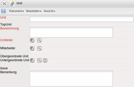 Im folgenden Beispiel soll eine neue Unit angelegt werden. Zunächst aktiviert man die Funktionalität “Neues Dokument” mit der Auswahl “Unit”.