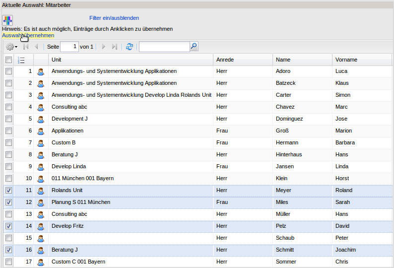 … entsprechende Auflistung aller Mitarbeiter angezeigt. Hier können nun die Mitarbeiter ausgewählt und übernommen werden …