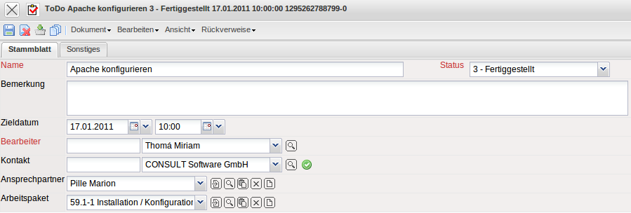 Die Maske To-Do beinhaltet Informationen über den Bearbeitungsstatus, Datum, Mitarbeiter, Kontaktdaten und das zugeordnete Arbeitspaket. Die To-Do’s werden überwiegend Arbeitspaketen zugeordnet und dann als Checkliste verwendet.