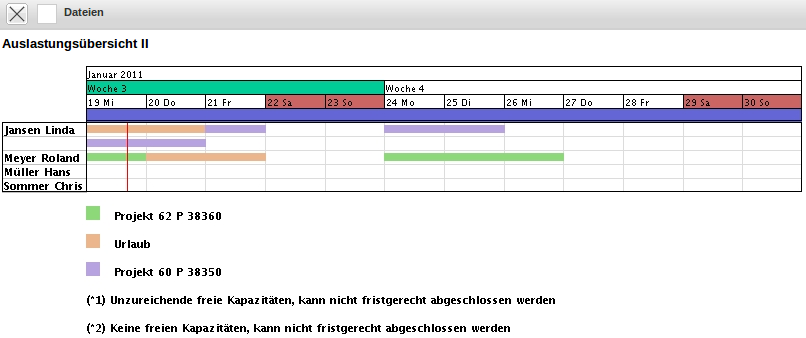 Die Auswertung Auslastungsübersicht II generiert mitarbeiterbezogen eine Übersicht über alle Aufgaben der Mitarbeiter und ordnet diese gemäß ihrer Planzeiträume an. Bei dieser Variante werden die Prioritäten als erste Stufe ignoriert und der Planzeitraum als Kriterium der Reihenfolge berücksichtigt. Ein weiterer Unterschied zur Variante I ist der Hinweis, wenn Aufgaben aufgrund fehlender Kapazitäten nicht rechtzeitig beendet werden können.