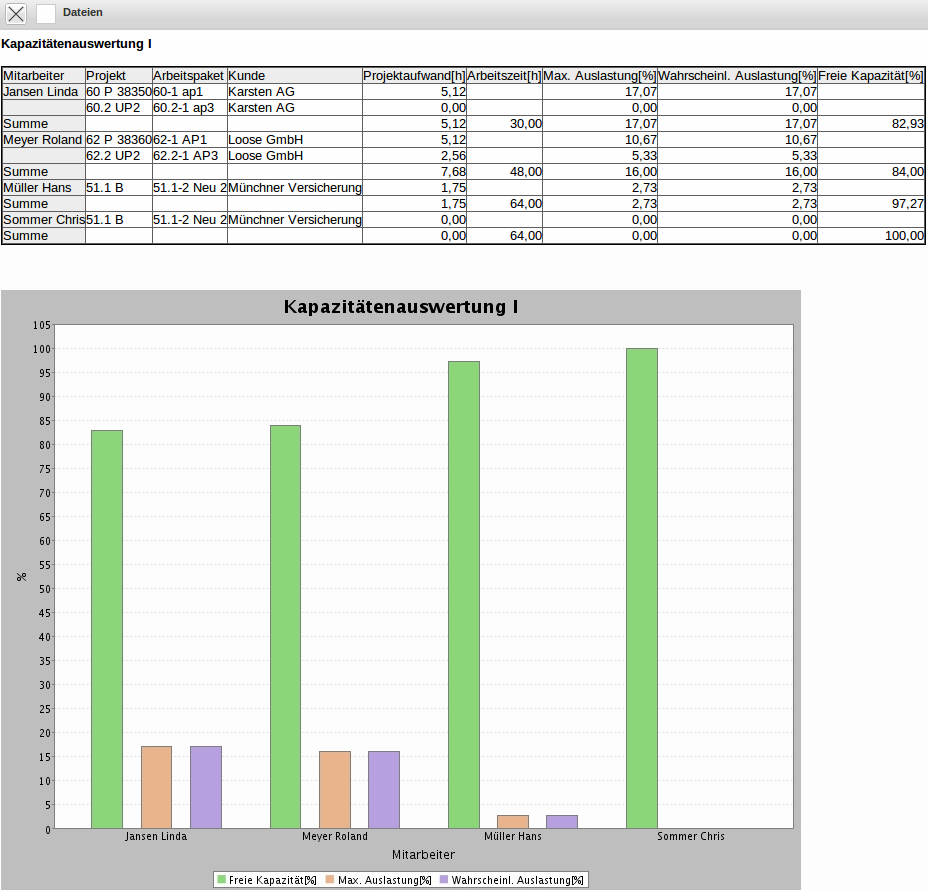 Die Arbeitszeit ergibt sich aus der Plan-Arbeitszeit des Mitarbeiters unter Berücksichtigung der geplanten Abwesenheiten (Urlaub, Krankheit, Mutterschutz, …). Die maximale Auslastung ist dann der Quotient aus der geplanten Projektzeit und der geplanten Arbeitszeit im Betrachtungsintervall unter der Annahme, dass auch die geplanten Projekte aktiv werden. Der Wert der wahrscheinlichen Auslastung berücksichtigt darüber hinaus noch die Projektwahrscheinlichkeit der passiven Projekte und plant die Projektzeiten für diese Aufgaben nur anteilig ein. Die freie Kapazität ergibt sich als Differenz der maximalen Auslastung eines Mitarbeiters (aus den Stammdaten) und der maximalen Auslastung im Betrachtungszeitraum.