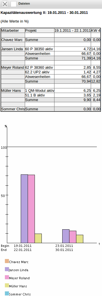 Die Kapazitätenauswertung I generiert mitarbeiterbezogen eine Übersicht über alle geplanten Aufgaben der Mitarbeiter. Dabei werden Feiertage und die Abwesenheiten der Mitarbeiter berücksichtigt.