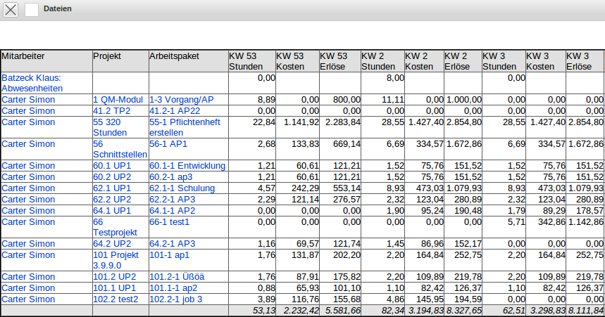 Die Mitarbeiterauswertung beinhaltet die mitarbeiterbezogenen Auswertungen und Übersichten bezüglich Auslastung und Kapazitäten. Dazu gehören allgemeine Übersichten, Zeit- und Tätigkeitsnachweise, Plan/Ist-Vergleich, Auslastungs- und Kapazitätsauswertungen und Übersichten über Abwesenheiten (Urlaub, Krankheit, …).