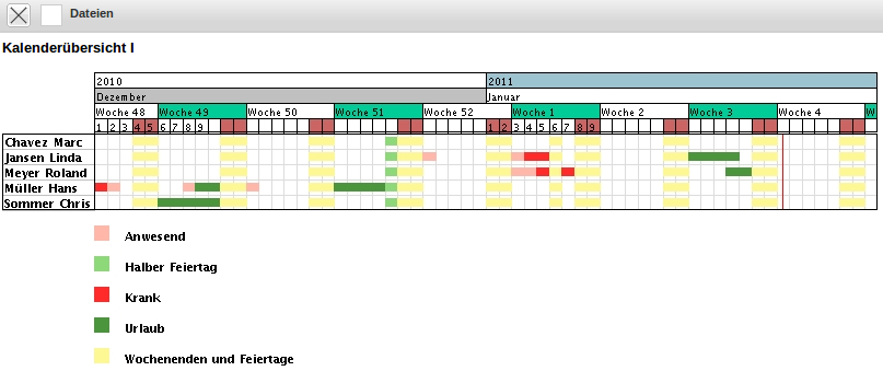 Diese Kalenderübersicht generiert eine Übersicht über die An- und Abwesenheiten der ausgewählten Mitarbeiter im Betrachtungszeitraum. Diese Variante zeigt dabei alle Abwesenheiten an (Urlaub, Krankheit, Mutterschutz, …).