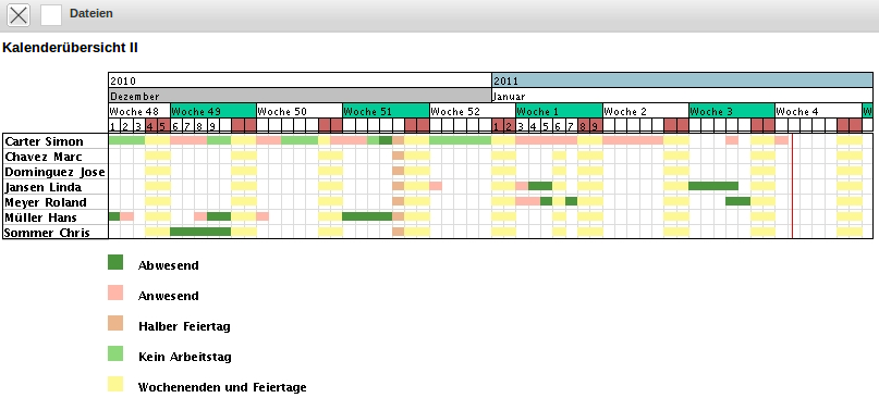 Die Kalenderübersicht II generiert eine Übersicht über die An- und Abwesenheiten der ausgewählten Mitarbeiter im Betrachtungszeitraum. Diese Variante zeigt dabei die Abwesenheiten nur in allgemeiner Form an und unterscheidet nicht in verschiedenen Abwesenheitsarten wie beispielsweise Urlaub oder Krank.