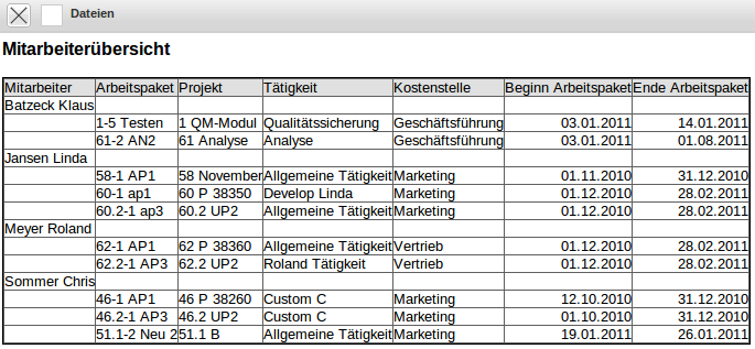 Die Auswertung Mitarbeiterübersicht liefert eine Übersicht über die Zuordnung von Mitarbeiter, Projekt und Tätigkeit. Hier werden Informationen zur Verfügung gestellt, welcher Mitarbeiter zu welchem Zeitpunkt für welches Projekt tätig ist. Diese Auswertung basiert ausschließlich auf den Plandaten (auch Start und Ende) der Arbeitspakete.