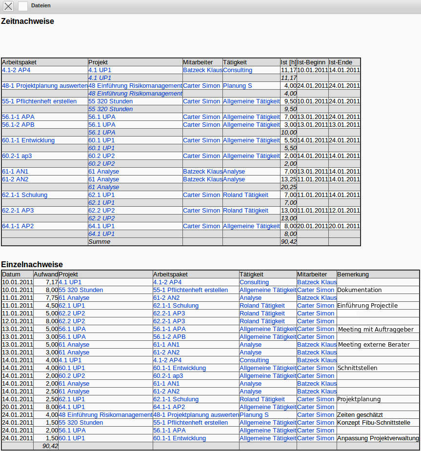 Die Auswertung Zeitnachweise liefert eine Übersicht über die Projektleistungen der Mitarbeiter und die Auflistung der einzelnen Tätigkeiten mit den Bemerkungen aus der Zeiterfassung. Diese Auswertung generiert eine Übersicht über die Summen- und Einzelzeitnachweise eines Mitarbeiters basierend auf der Erfassung im TimeTracker für die Arbeitspakete der Mitarbeiter. Die Auswertung wird in der Regel für interne Nachweis für das Controlling oder als externer Nachweis als Anlage zur Rechnungsstellung verwendet.