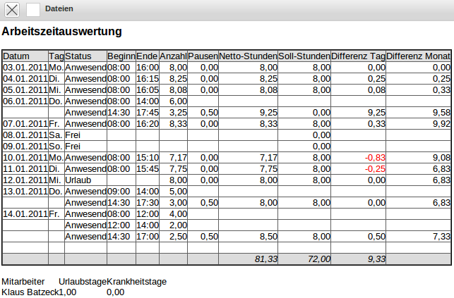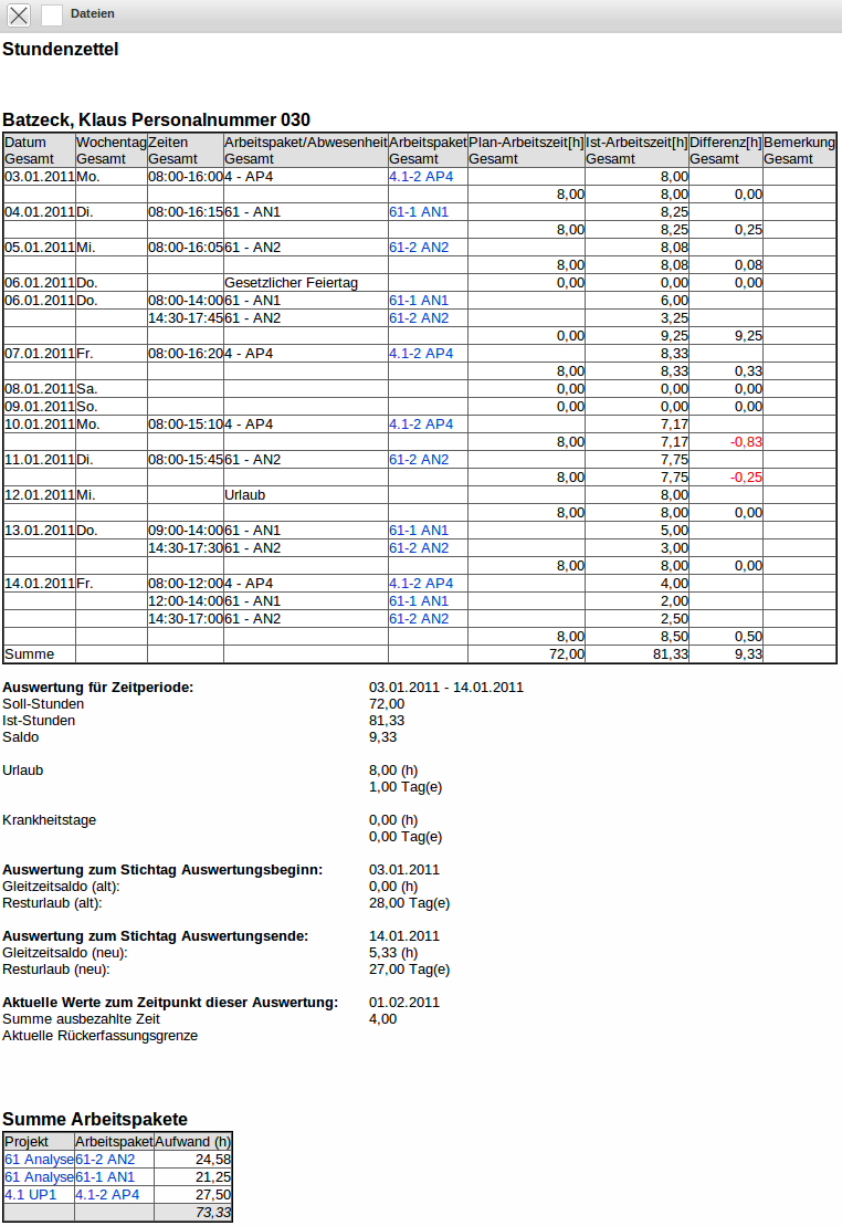 Im Gegensatz zum Tätigkeitsnachweis werden hier die Bemerkungen des TimeTrackers angezeigt und die Daten der Arbeitszeitverwaltung (Urlaubskonten, Krankheit, Gleitzeitzeit) aufgelistet. Optional können auch die Buchungen aus den Arbeitszeitkonten und eine Auflistung der gebuchten Arbeitspakete angezeigt werden.