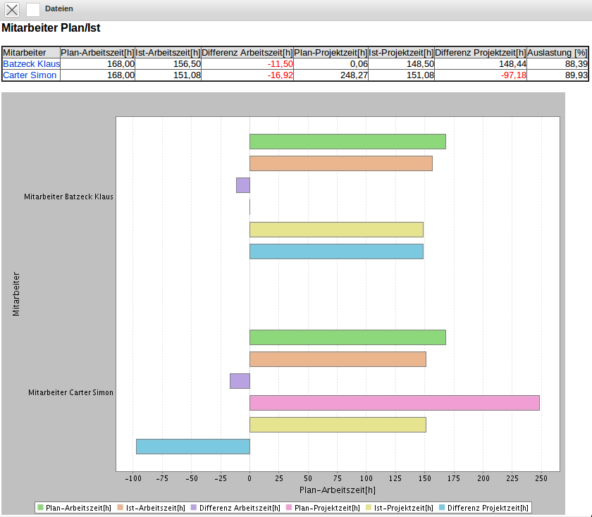 Eine entsprechende Auswertung auf Basis der Plandaten im System liefert die Auswertung Mitarbeiterübersicht.