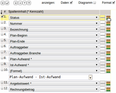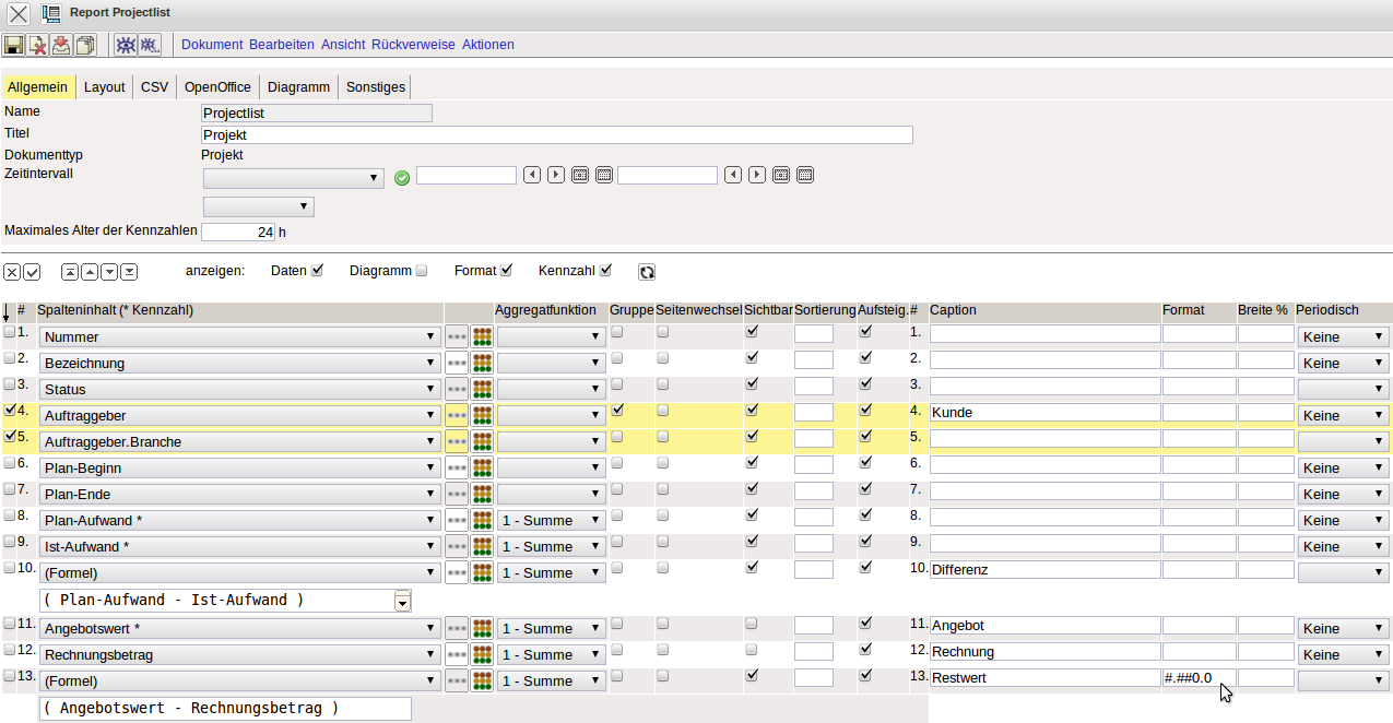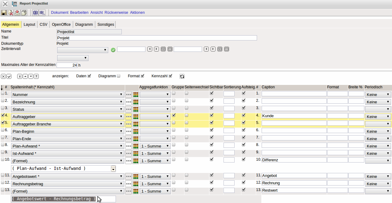 Anschließend werden in den Report noch einige Felder umsortiert und mit Hilfe der Funktionalität eine Formel definiert. Die neue Spalte 13 soll das Ergebnis (Restwert) aus der Differenz vom Angebotswert und den Rechnungsbetrag sein und summiert werden.