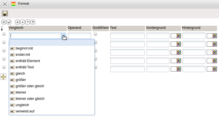 Im Dialog können im Feld Vergleich die Vergleichsoperatoren und der Operand eingestellt werden. Die Werte können entweder textlich umgesetzt werden (TEXT) oder farblich (Vordergrund- oder Hintergrund-Farbe).