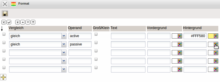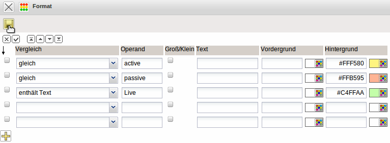 Im Beispiel wird für das Feld Status der Wert “aktiv” (intern active) mit gelben Hintergrund umgesetzt und der Wert “passiv” (intern passive) mit roter Hintergrundfarbe.