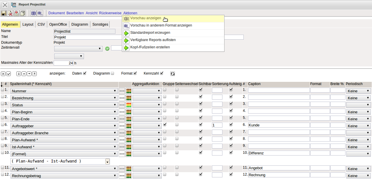 Die beiden Zwischenergebnisse (Spalte11 und 12) sollen nicht im Report aufgelistet werden; deshalb können bei diesen Werten die Checkboxen “Sichtbar” auf Falsch gesetzt werden (nicht markiert).