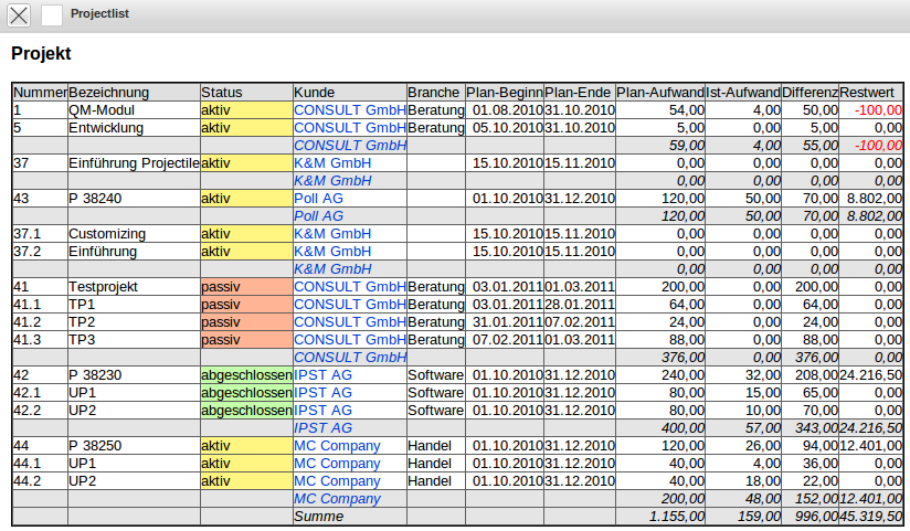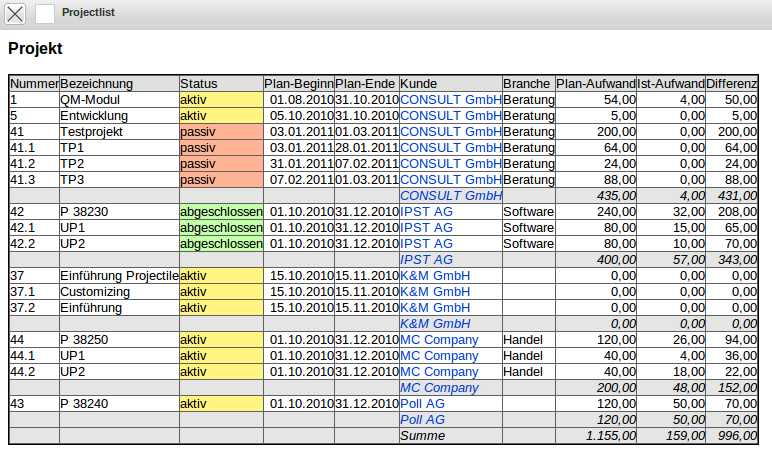 Alle Statusinformationen die den Wert “Live” beinhalten werden mit grüner Hintergrundfarbe umgesetzt (also alle Projekte die beendet sind).