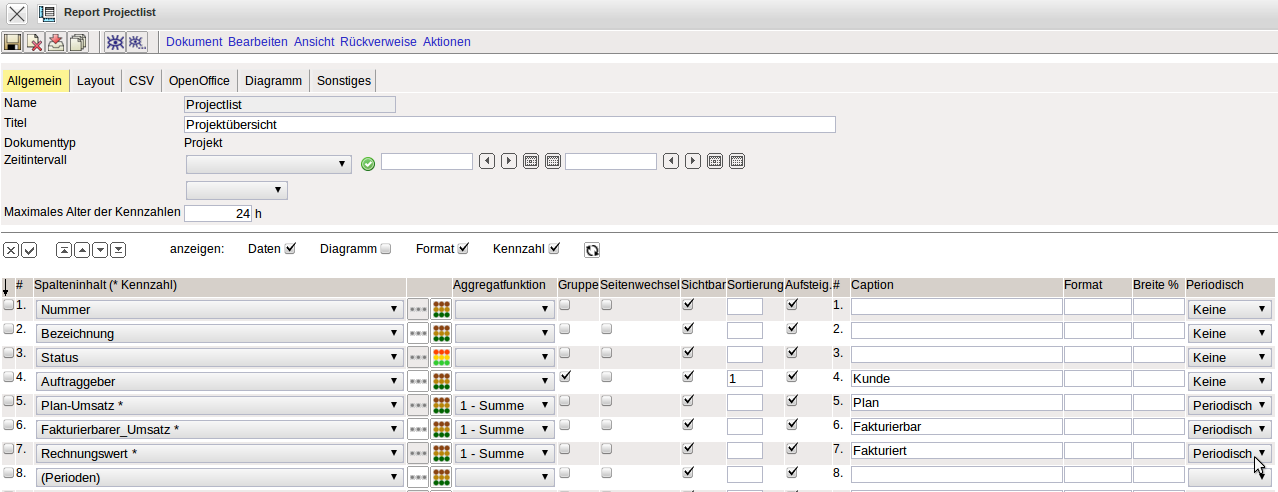 Im folgenden Beispiele werden in einer Projektübersicht Kennzahlen mit Abgrenzung verwendet. Für die Kennzahlen werden in der letzten Spalte die Eigenschaften der Perioden definiert. Im Beispiel werden die Kennzahlen periodisch abgegrenzt. Der Eintrag (Perioden) in Zeile 8 steuert die Verwendung periodischer Kennzahlen.