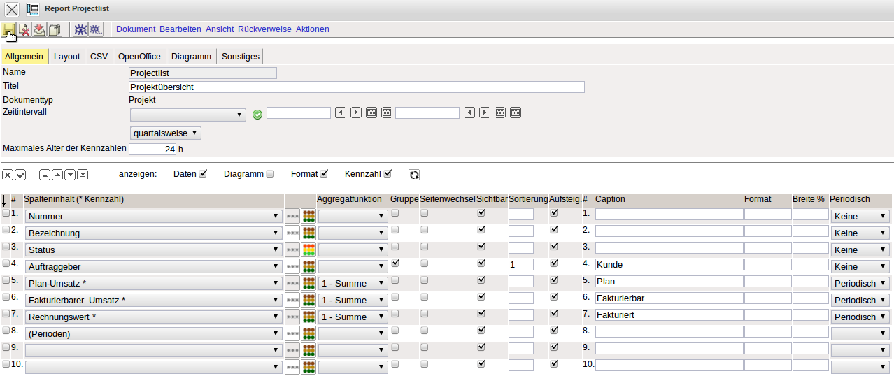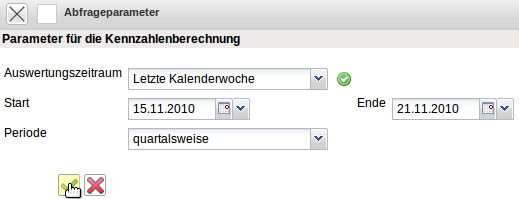 Im Kopf der Reportdefinition kann ein Zeitintervall (hier letztes Kalenderjahr) und die Periode für die Abgrenzung (quartalsweise) eingegeben werden. Diese Eingaben sind bei der Ausführung die Vorbelegungen im Zwischendialog.