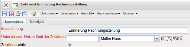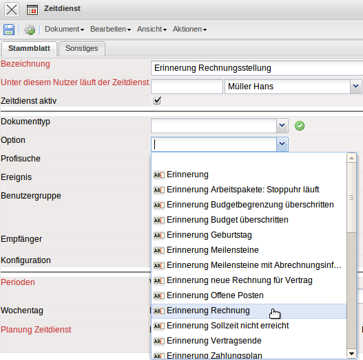 Im Beispiel wird die Option “Erinnerung Rechnung” ausgewählt. Dieser Zeitdienst versendet eine Mail, wenn eine vorkonfigurierte Rechnung (beispielsweise aus Verträgen) zur Rechnungsstellung fällig ist.