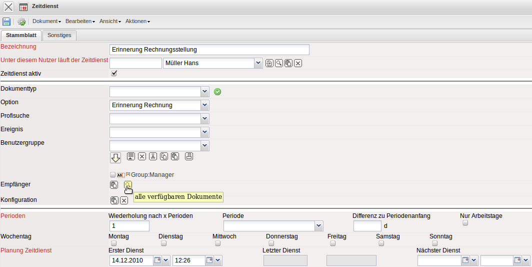| 7 | Erinnerung Vertragsende | Dieser Zeitdienst überprüft alle Verträge (nicht Mitarbeiterverträge) und meldet alle Verträge, die in genau(!) einer im Vertrag eingetragenen Periode enden, an eingetragene Empfänger. Die Periode des Zeitdienstes sollte deshalb täglich sein! |