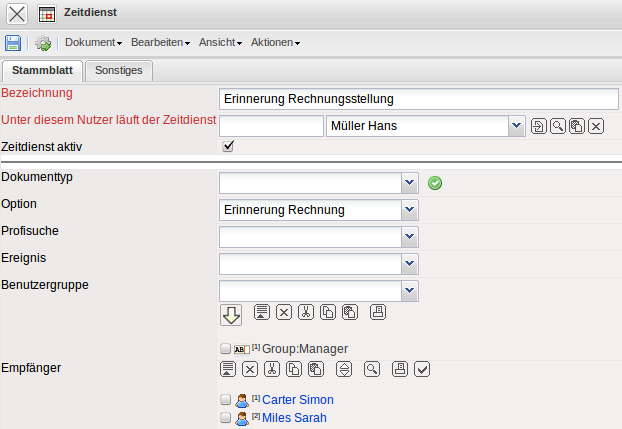 | 1 | Erinnerung | Betreff und Text aus dem Zeitdienstdokument wird an den Empfänger versendet. Ansonsten keine weiteren Aktionen. |