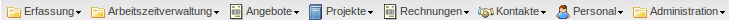 Die Menüleiste beinhaltet wichtige Funktionalitäten zur Erfassung, Arbeitszeitverwaltung, Angeboten, Projekten, Rechnungen, Kontakten, Personalangelegenheiten und Administrationen.