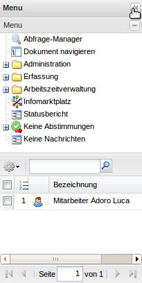 Das linke Navigationsmenü besteht aus den Funktionalitäten Abfrage-Manager, Navigation und Funktionen für die Administration, der Erfassungskomponente, verschiedenen Modulen von Projectile und den Menüpunkten für die Abstimmungen und die internen Benachrichtigungen. Darüber hinaus beinhaltet das linke Navigationsmenü die persönliche Ablage (siehe auch Abschnitt 3.02.01). Das linke Navigationsmenü kann mittels Klick auf den Doppelpfeil am oberen Rand ein- und ausgeklappt werden. Im eingeklappten Zustand bringt ein Klick auf den Balken das Menü temporär zum Vorschein.