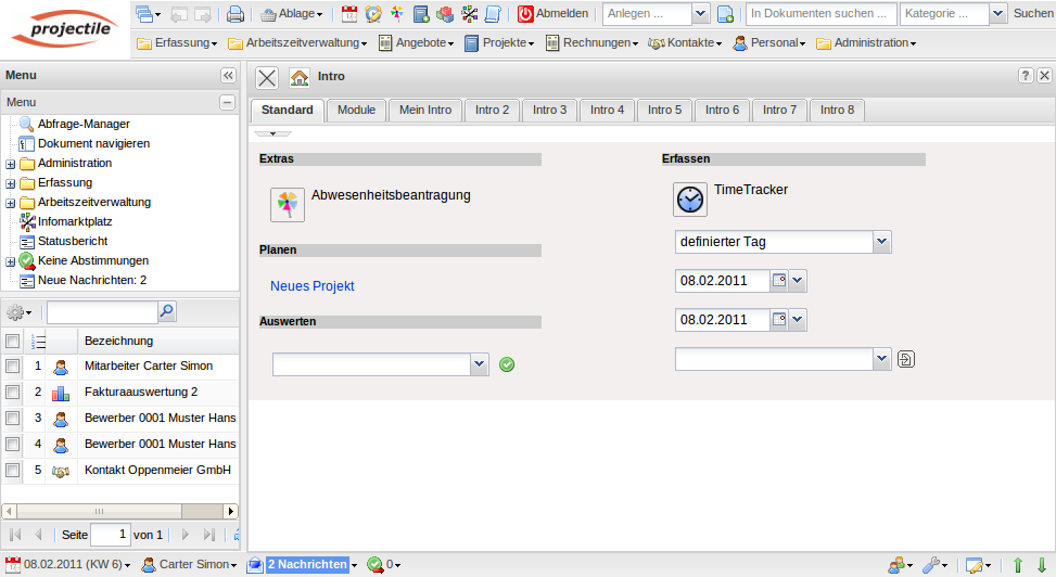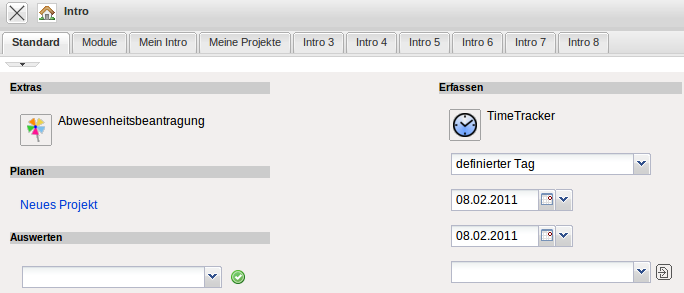 Im zentralen Bereich befindet sich das Intro mit frei definierbaren Eingangsbildschirmen. Das Beispiel zeigt den Standard-Bildschirm mit Funktionalitäten zum Anlegen neuer Daten, der Projektplanung, dem Auswertungssystem und der Leistungserfassung TimeTracker.
