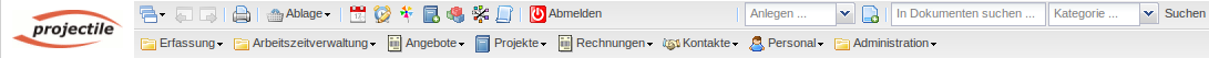 Die obere Navigationsleiste besteht aus dem Fenster-Manager, der „Blättern“-Funktionalität, einer Toolbar, der Dokument-Anlage-Box, einer Suchmaschine, einer Menüleiste und der “Home-Funktionalität” (Projectile-Logo).
