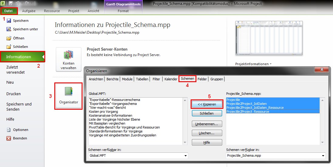 Das Schema wird in der MS Project Datei Projectile_Schema.mpp ausgeliefert. Das Schema befindet sich im Menüpunkt Schnittstellen ⇒ MS Project Schema. Hier kann das Schema jetzt lokal (mit der rechten Maustaste) gespeichert werden.