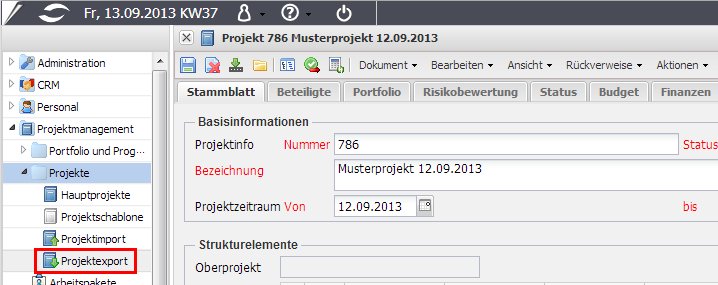 Zunächst wird das Projektdokument geöffnet, welches exportiert werden soll. Anschließend wird über den Eintrag Projektmanagement > Projekte > Projektexport (im linken Menü) die CSV-Datei erzeugt …