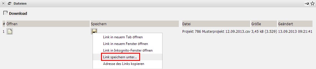 Das Exportfile muss jetzt gespeichert werden. Im Chrome beispielsweise, klickt man den Link mit der rechten Maustaste an und wählt aus dem Menü den Eintrag “Link speichern unter…”. Die Datei kann unter einem beliebigen Dateinamen mit der Endung .CSV lokal abgespeichert werden.