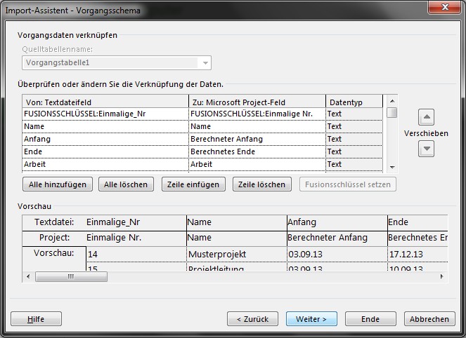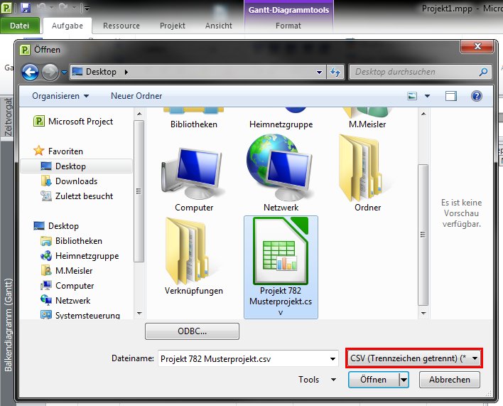 Mit folgenden Schritten lässt sich diese erzeugte CSV-Datei in MS Project importieren: