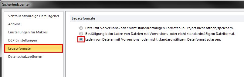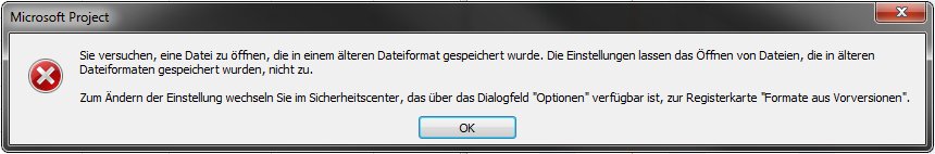 Anmerkung: Sollten Sie folgende Fehlermeldung bekommen, lassen Sie bitte das Laden von Dateien mit Vorversions- oder nicht standardmäßigem Dateiformat zu.