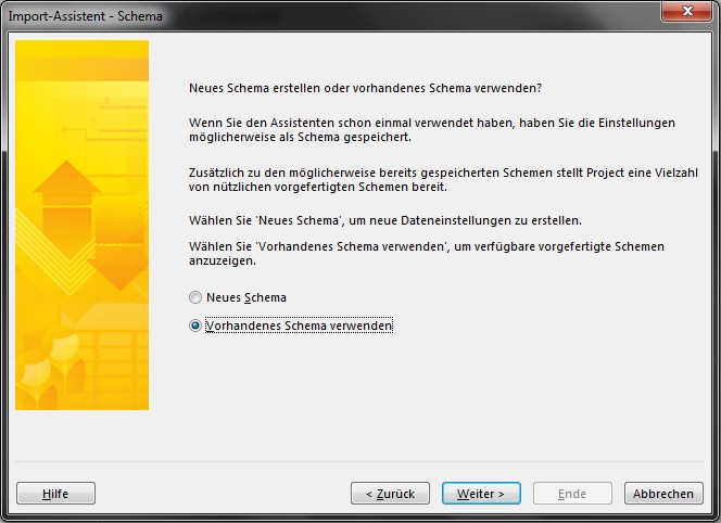 Wählen Sie “Vorhandenes Schema verwenden” und klicken Sie auf “Weiter”: